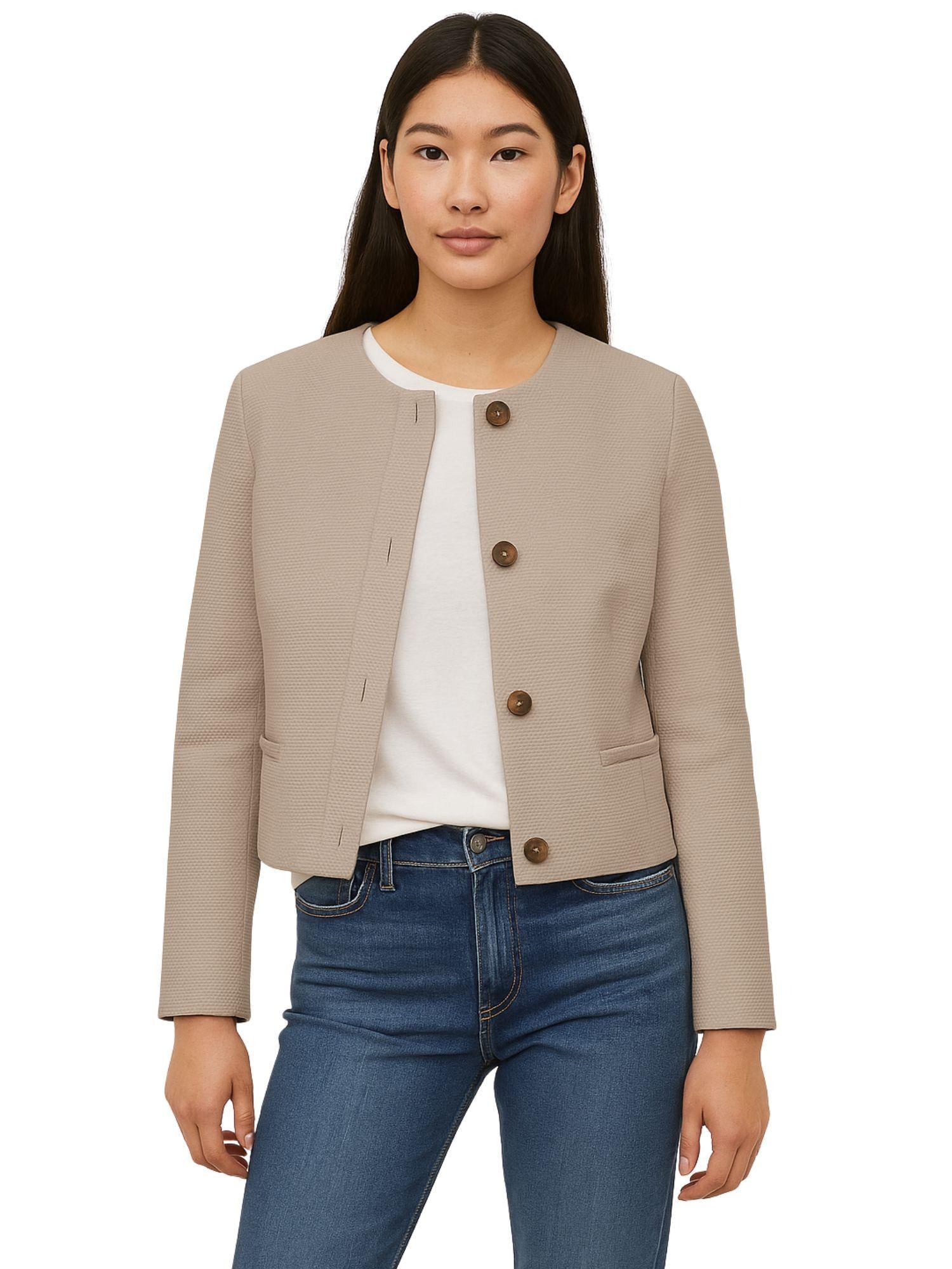 Giacca corta in stuoia armaturata di misto viscosa stretch, Fit femminile con linea sfiancata, collo stondato, chiusura con bottoni a vista effetto corno.