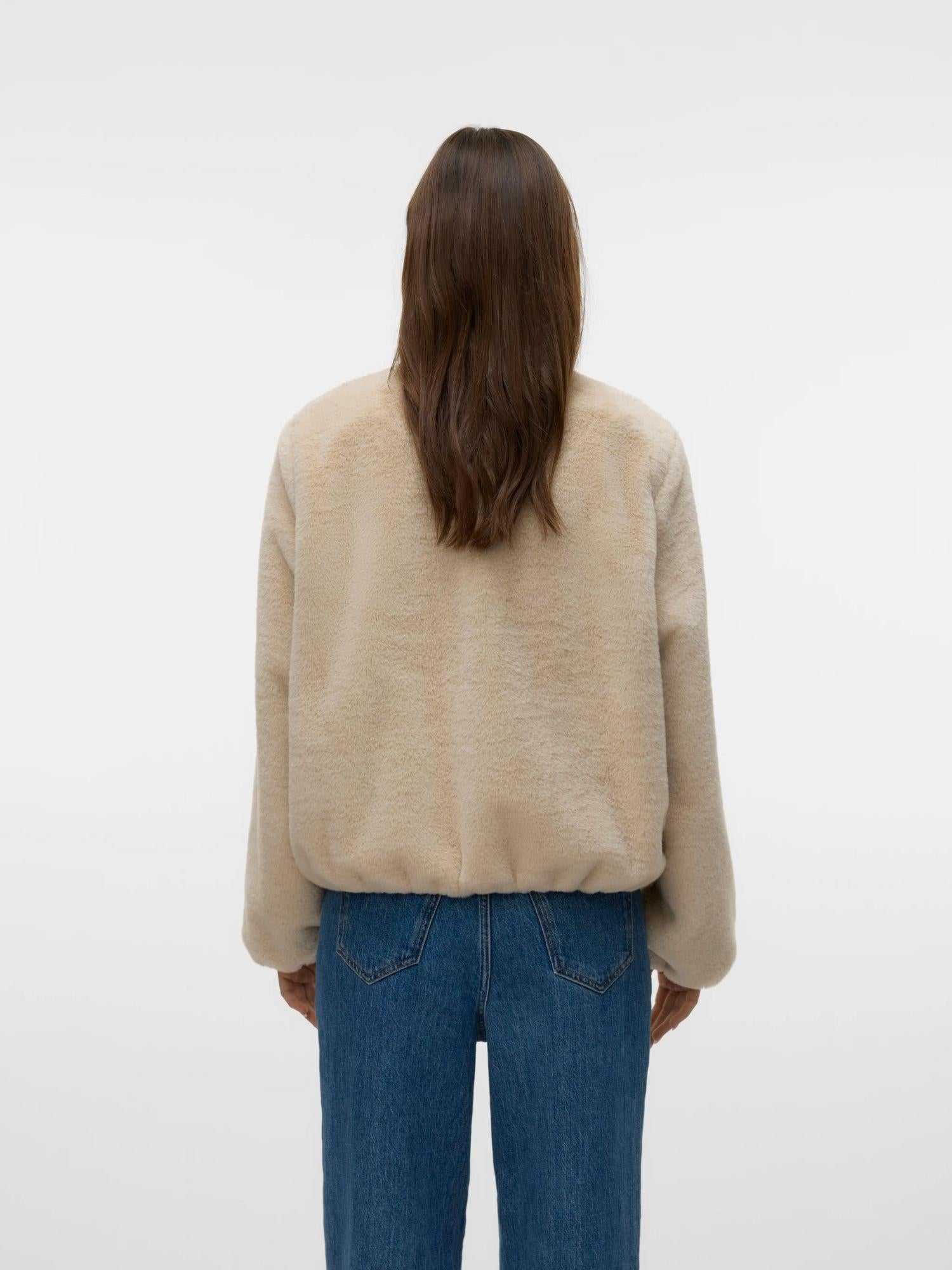 This elegant and timeless faux fur jacket is perfect for adding a refined and modern touch to your look. Ideal for both casual outfits and more elegant pairings with dresses and heels. It features a spread collar, long sleeves, and a zip closure. It features side pockets and is fully lined for comfort and warmth. Short length. Shell: 50% polyester, 50% recycled polyester. Filling: 100% polyester.