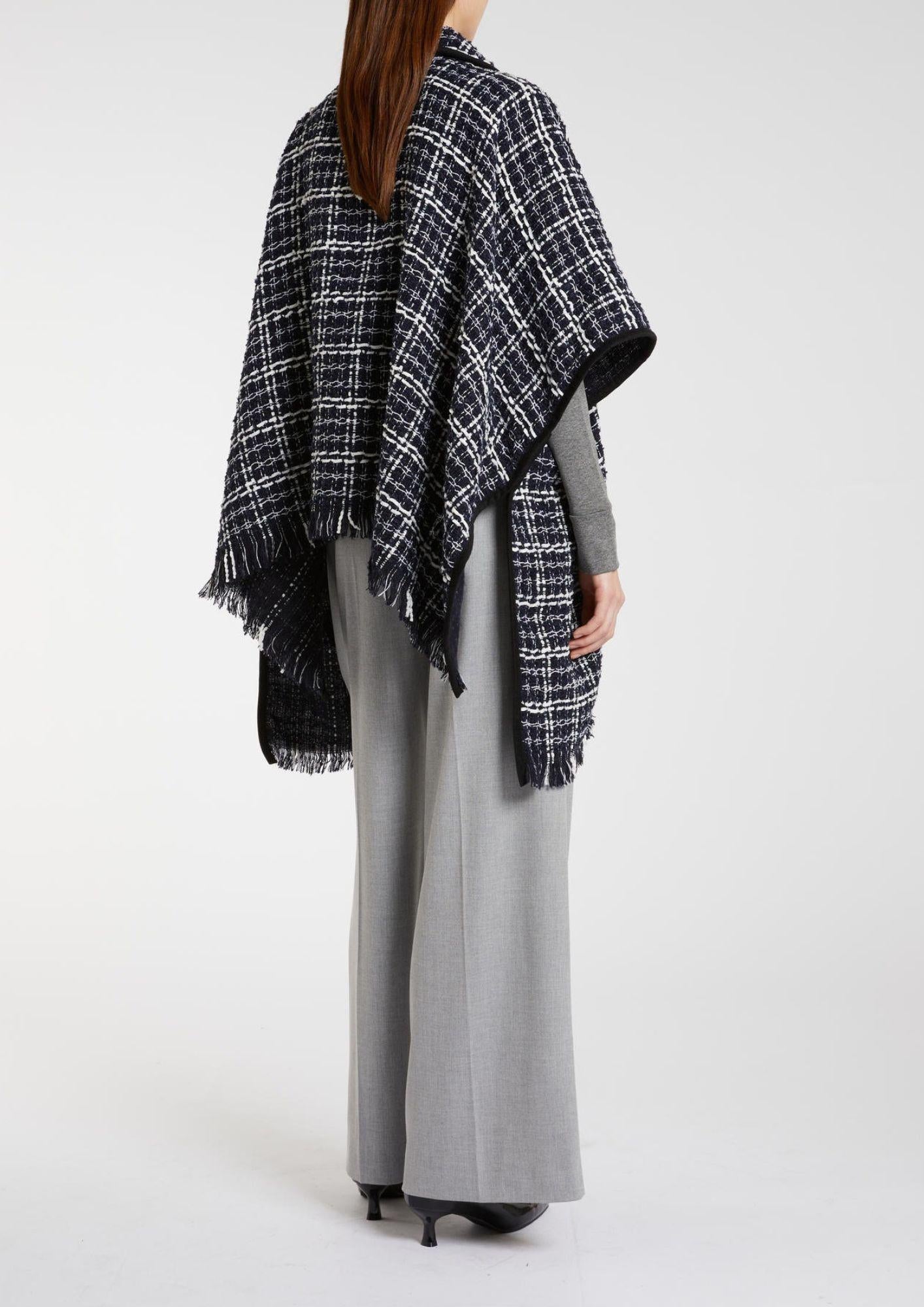 Soft bouclé fabric and a small lapel neckline define this new poncho by Marella. Perfect for wearing on autumn days, over a sweater or blazer. Poncho in technical bouclé fabric, lapel neck, and fringed hem. Fabric: 50% Polyester, 49% Acrylic, 1% Metallic Fiber