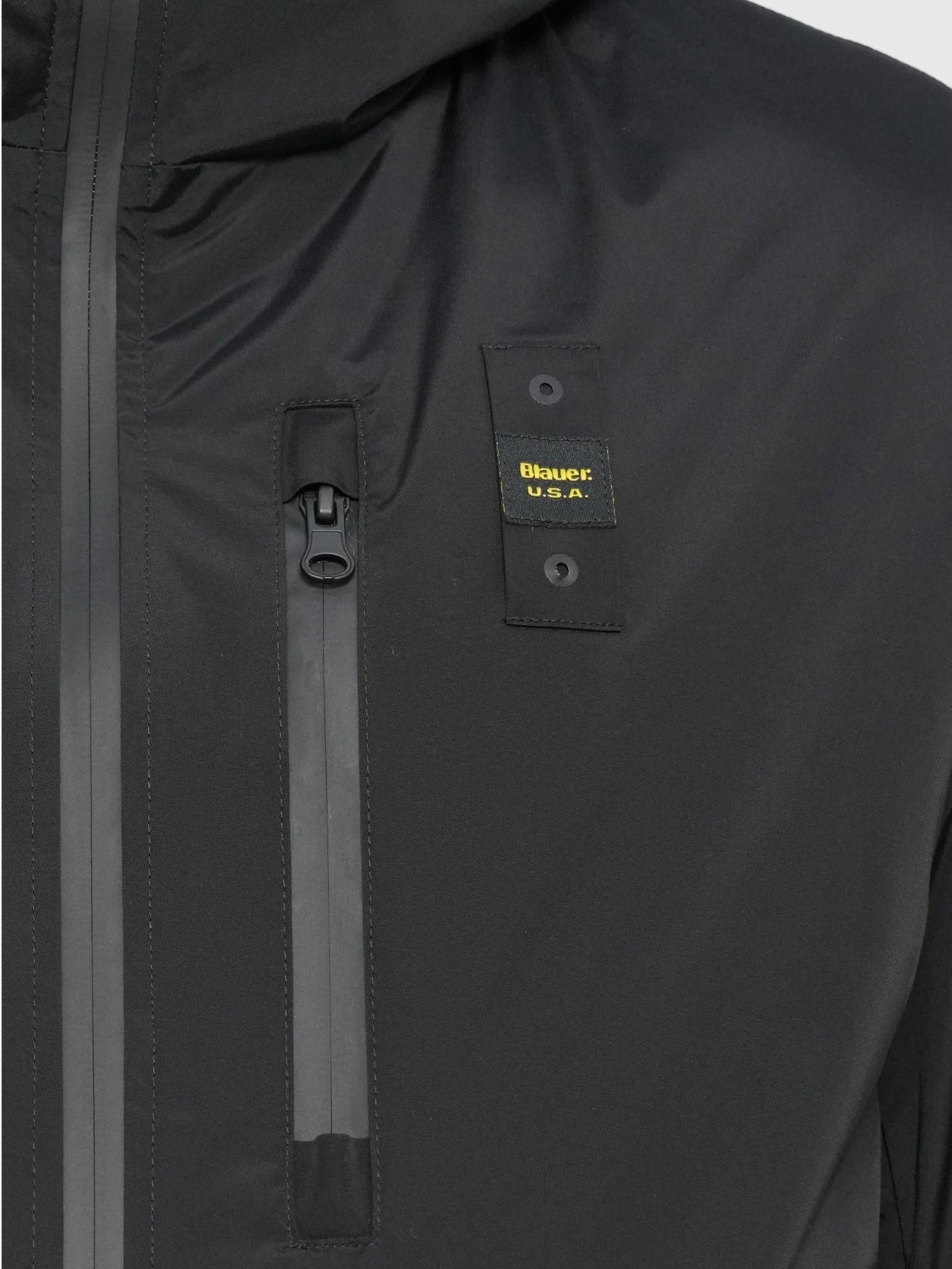 Long winter jacket in smooth, water-repellent double-layer nylon with a fixed hood and striped elastic trim, soft contrasting faux fur lining for maximum warmth and comfort, coated zip fastening with slider cover on the collar, coated zip pocket on the chest, side pockets with coated zip, striped elastic cuffs, internal pockets with Velcro, logo patch and loop for a modern and refined style.