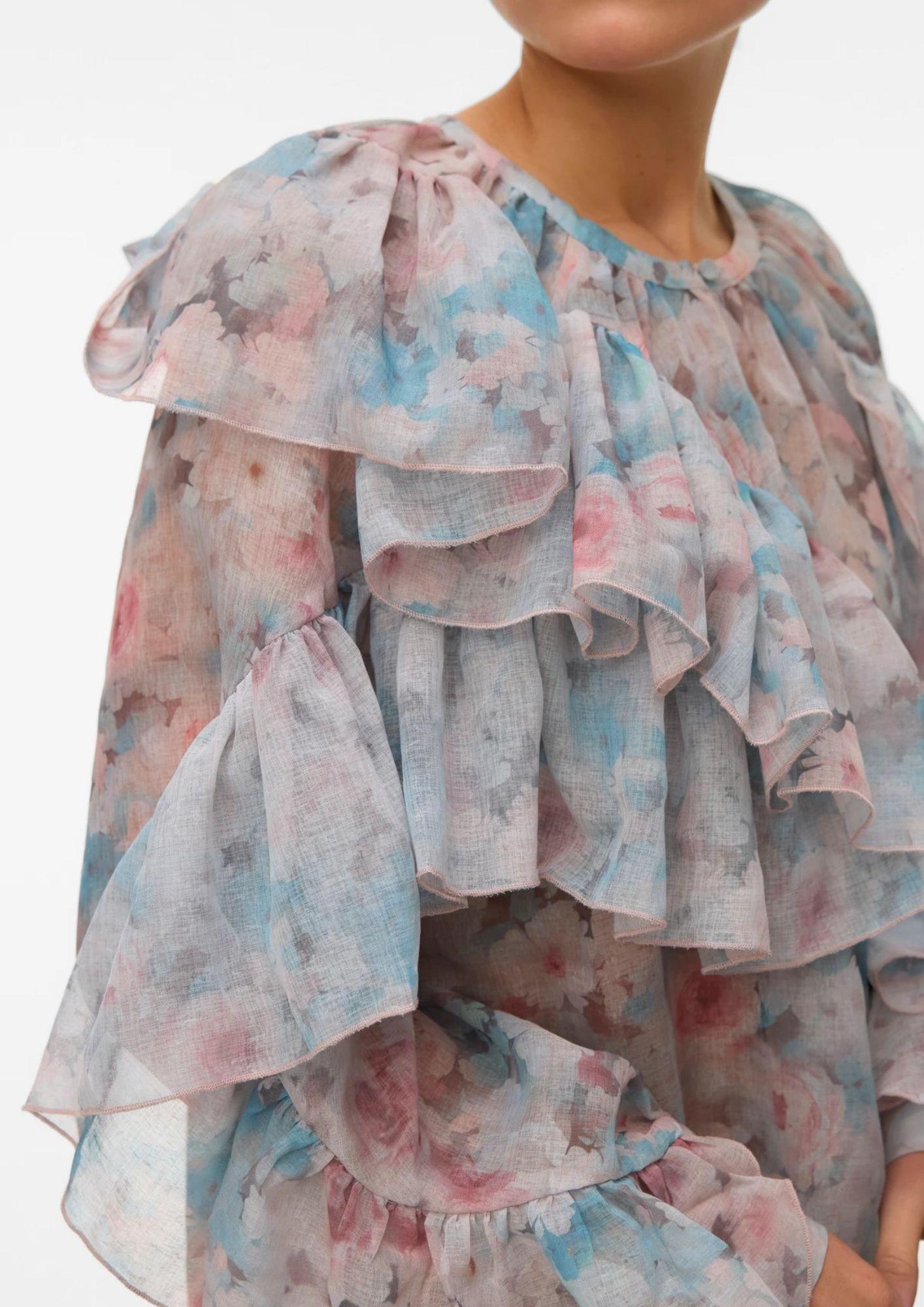 - Type de produit : Chemisier à col rond, manches longues et volumineuses, volants, coupe régulière. 100 % polyester recyclé