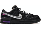 the nike dunk low off-white lot 50 features a black canvas upper with smooth black leather overlays and silver swooshes. from there, black soles with purple "lot 50 of 50" placquets, black overlays, and purple detailing complete the design.