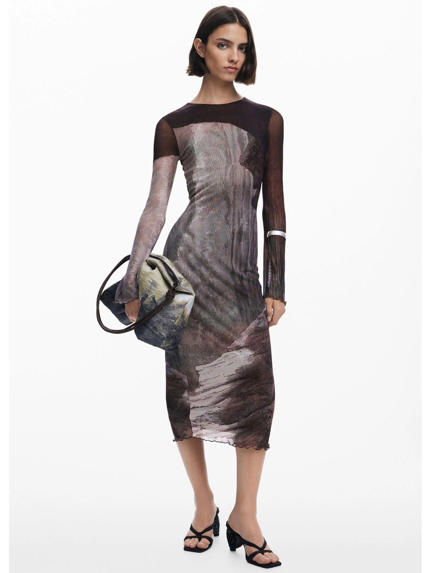 Long-sleeved flared midi dress with a round neck, ribbed trim, and a landscape print designed by Mr. Christian Lacroix. Arty print. Slim fit. Round neck. Long sleeves. Midi length. Zip fastening. Ribbed trim. Made from sustainable materials. AW25 collection. Exceptionelle capsule designed by Mr. Christian Lacroix. Designed in Barcelona. Recycled polyester. Outer fabric: 96% polyester, 4% elastane. Inner fabric: 95% viscose, 5% elastane.