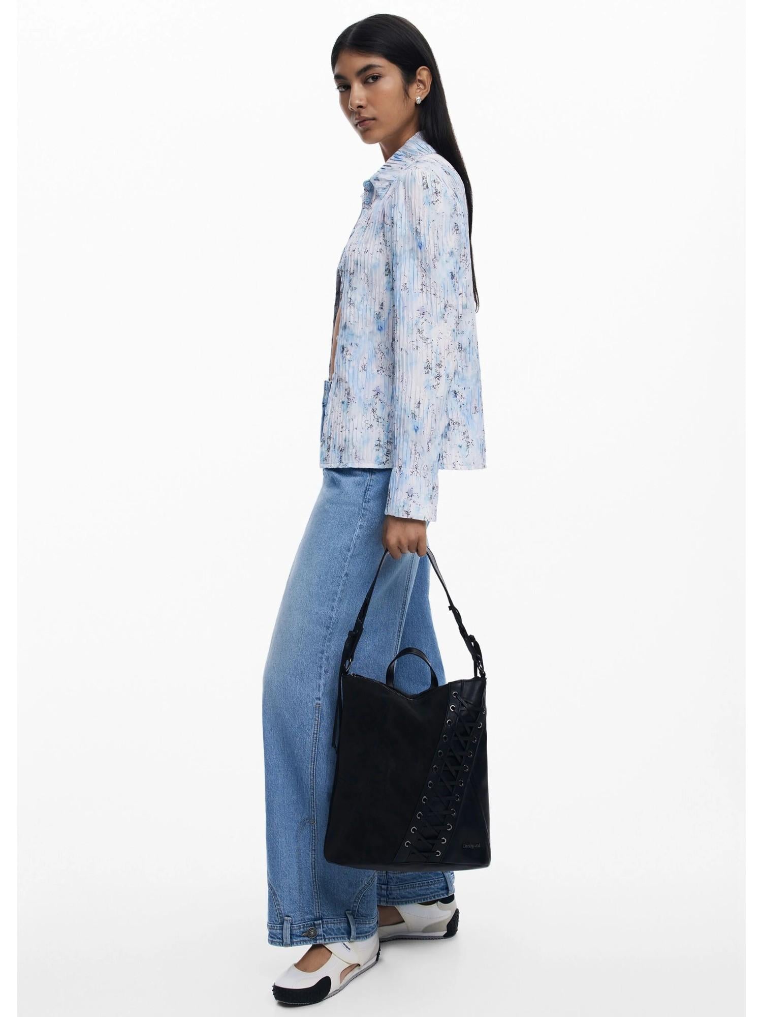 Small faux leather backpack with a woven corset-style detail on the front and a removable handle for carrying as a handbag. Braided detail. Metal eyelet details. External back pocket. Zipper closure. Internal zippered pocket. Removable handbag-style handle. Corset-style. Internal compartment. Leather effect. Designed in Barcelona. Dimensions: 30 x 10 x 30 cm. External composition: 100% POLYURETHANE. Internal composition: 100% POLYESTER. Trimming fabric material: 100% POLYURETHANE.