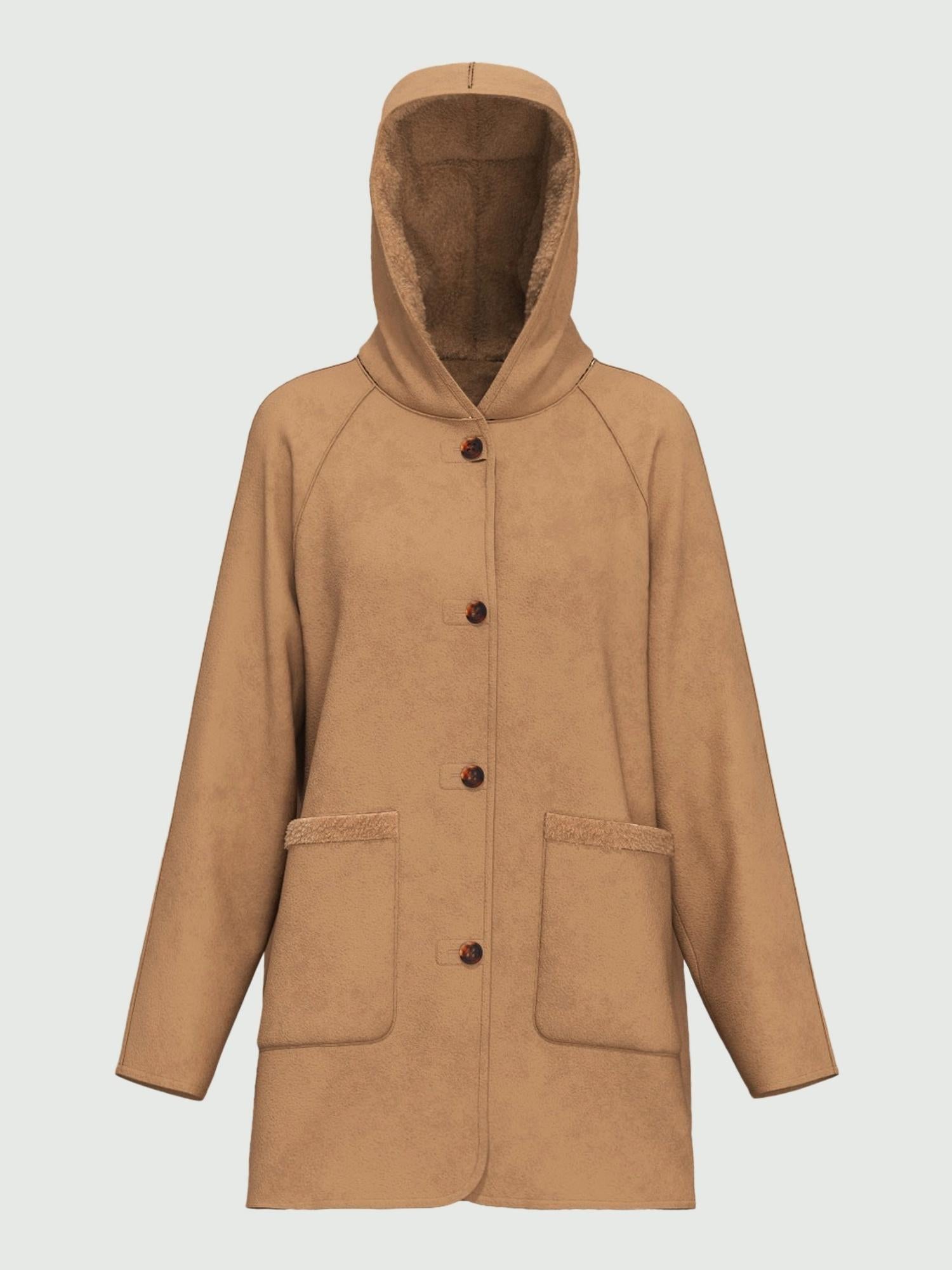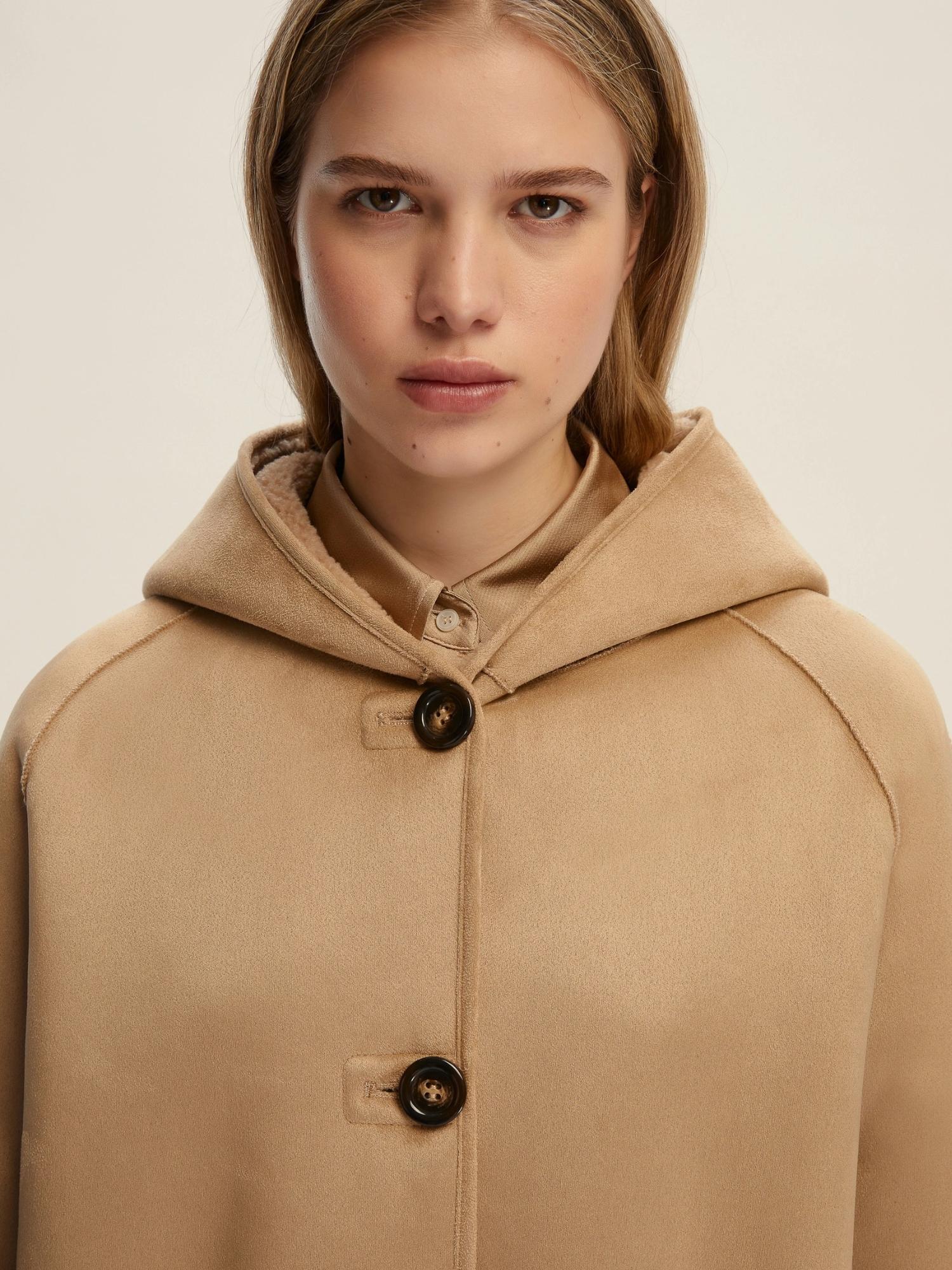Dual identity, same casual spirit. This reversible pea coat accompanies your movements with lightness and comfort. Wear it like an urban embrace, whether for city strolls or last-minute getaways. Reversible pea coat in velvety jersey bonded with a soft fabric. Straight fit. Hooded collar and raglan sleeves. Single-breasted closure with exposed buttons. Side pockets patched on one side and inset on the other. Outer fabric: 100% Polyester. Inner fabric: 100% Polyester.