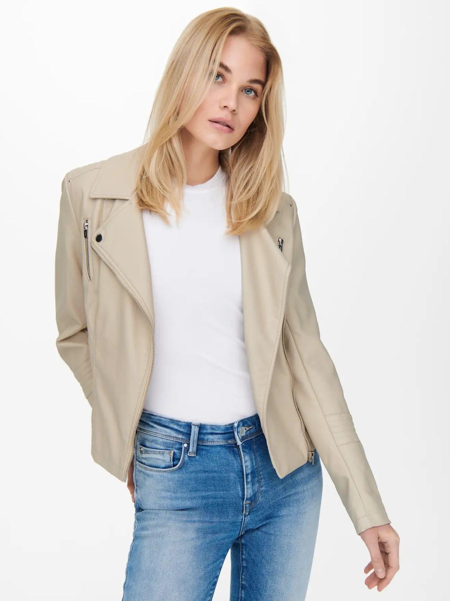 Giacca in pelle sintetica, collo rovescio, maniche lunghe, polsini con zip, Chiusura asimmetrica, tasche anteriori con zip, taglia corta, dettaglio trapuntato.