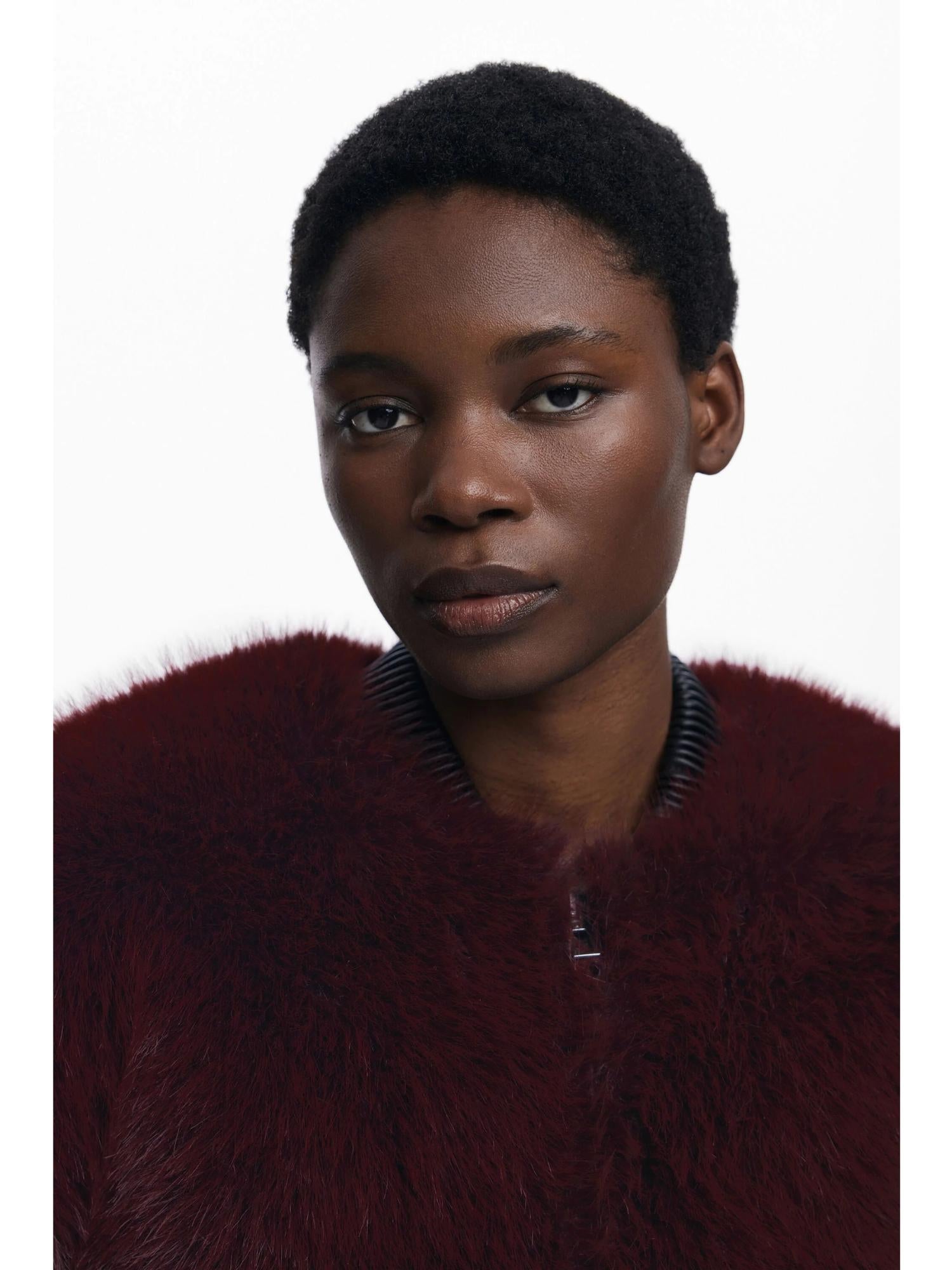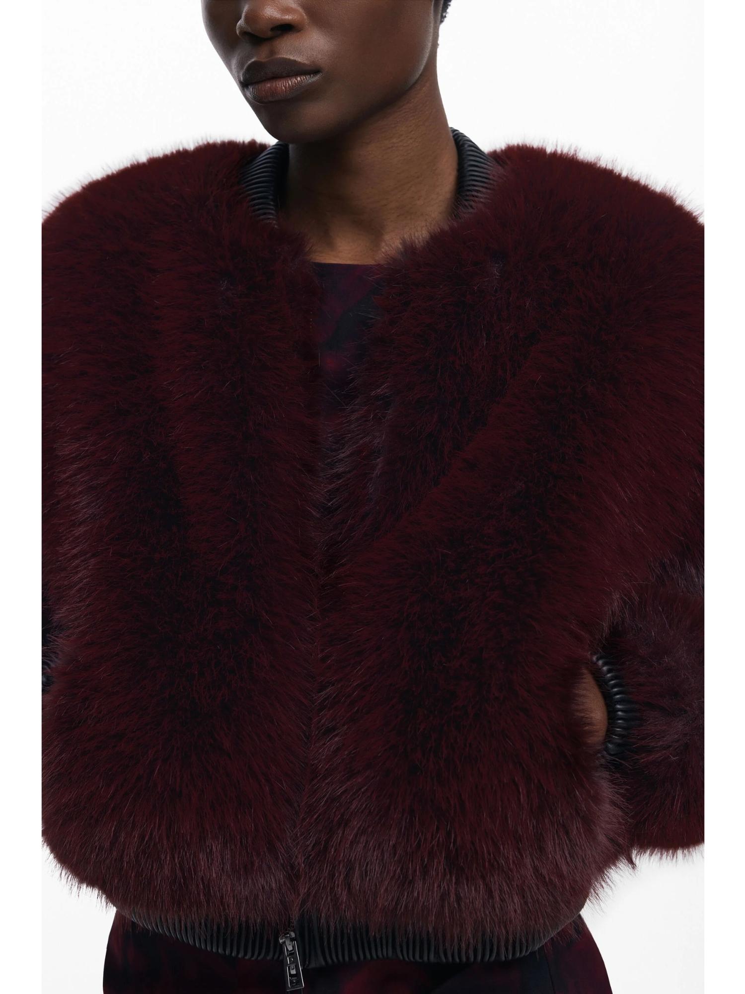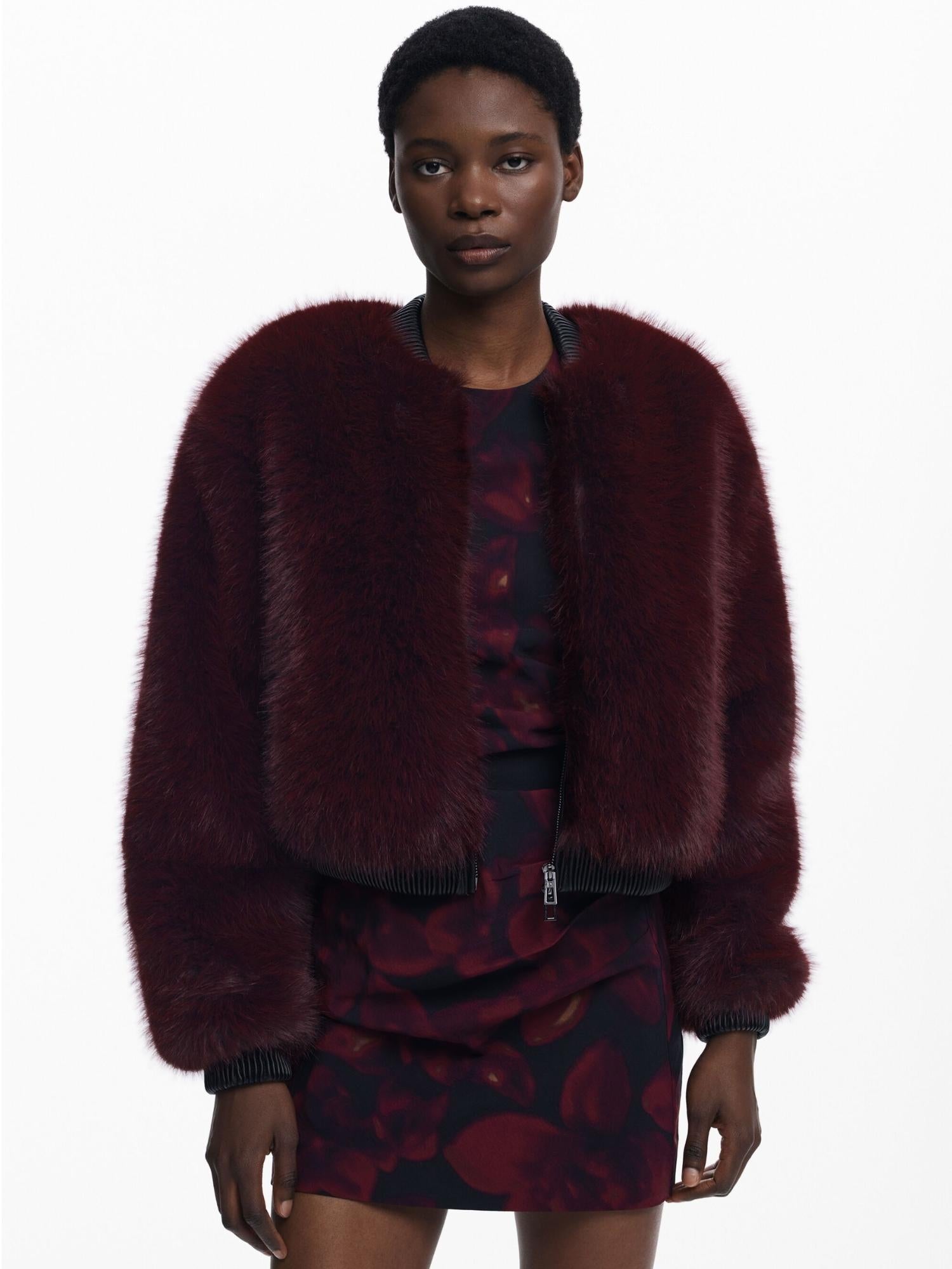 Short faux fur bomber jacket with a knitted collar and zip closure in raspberry. Color: Solid. Regular fit. Crew neck. Long sleeves. Zip closure. Knit collar. Faux fur. AW25 collection. Designed in Barcelona. Recycled polyester. Model measurements: height 180 cm, waist 61 cm, hips 89 cm. Model size: M. Outer fabric: 100% polyester. Inner fabric: 52% polyester, 48% viscose.