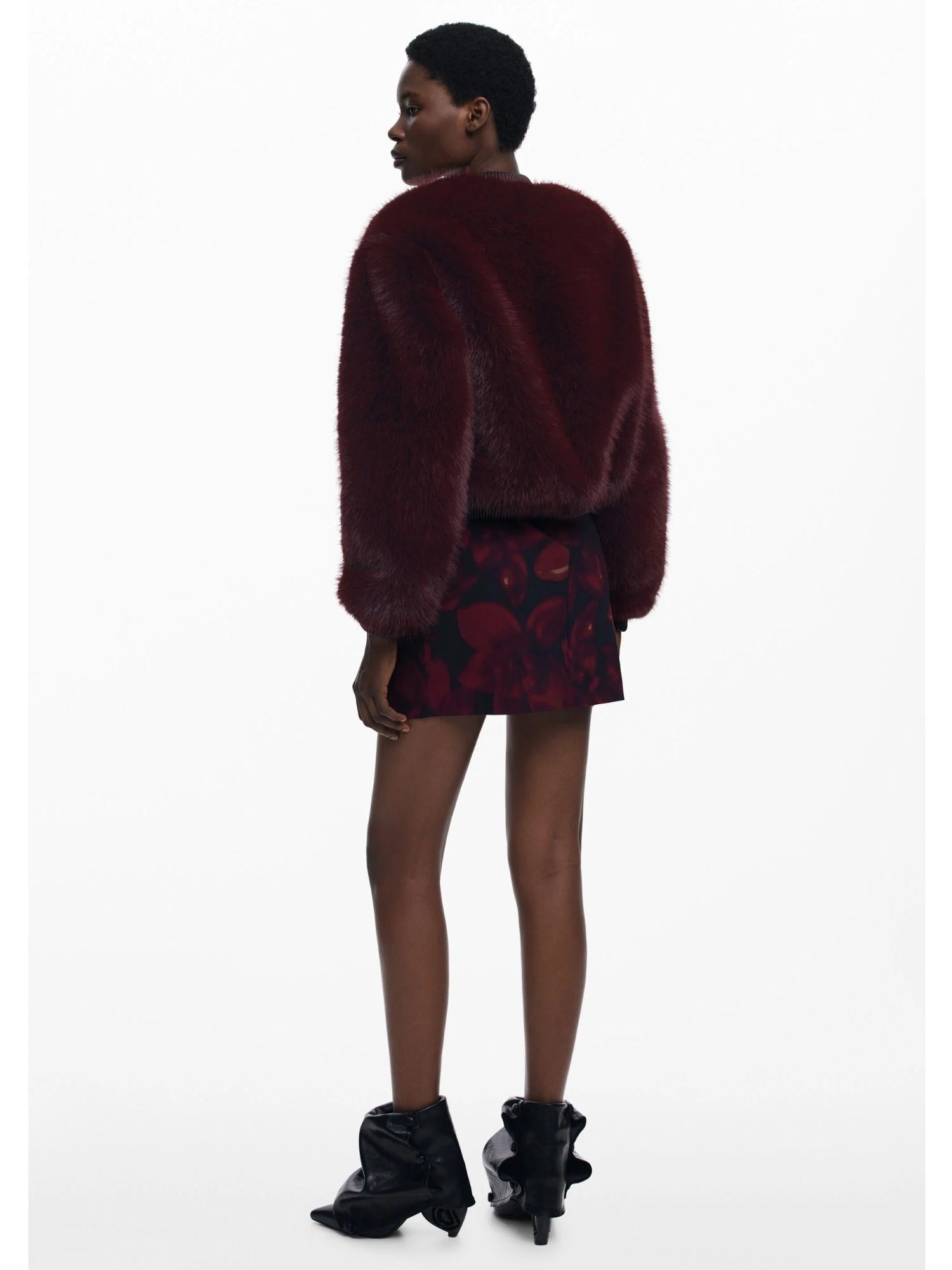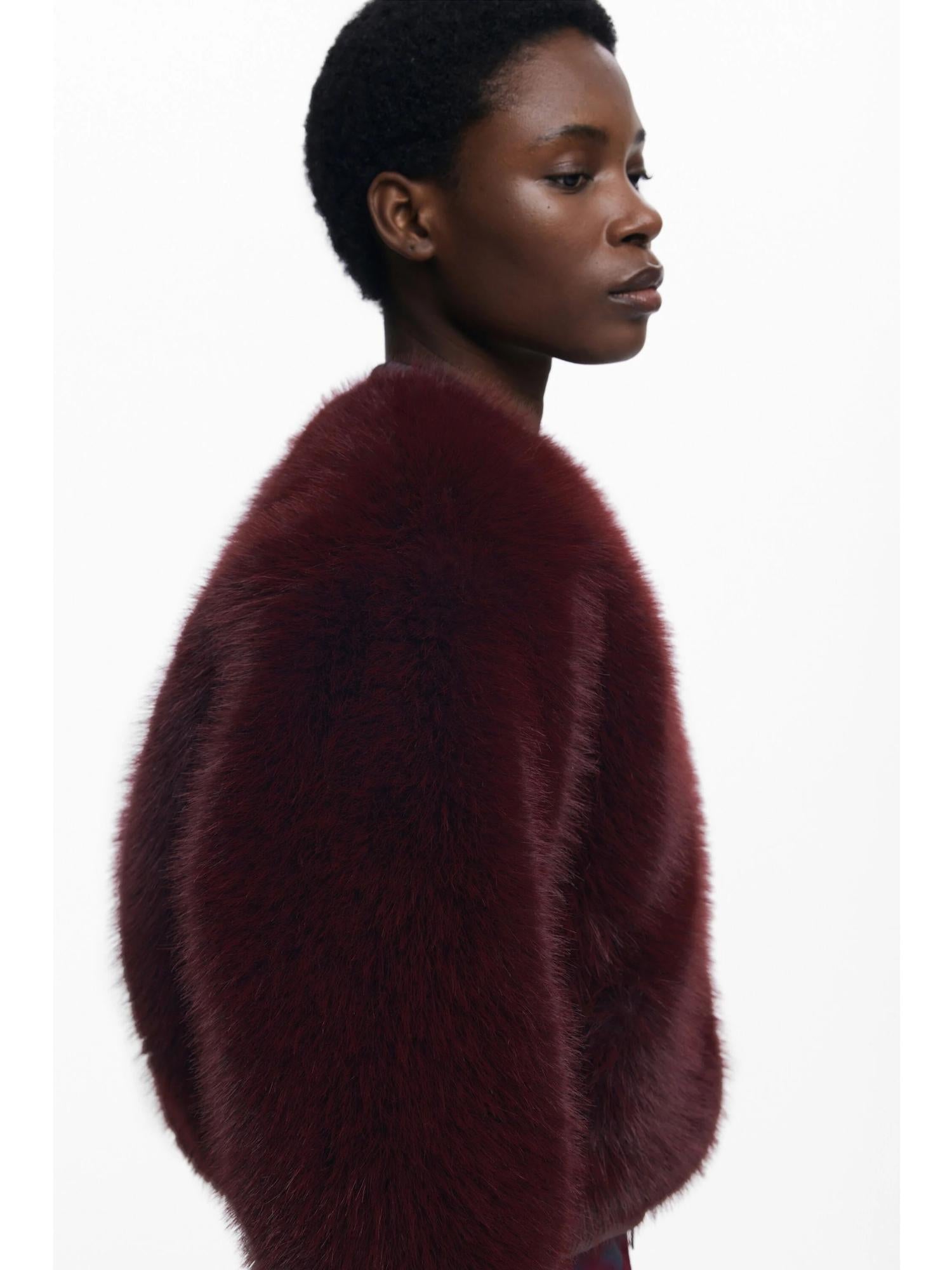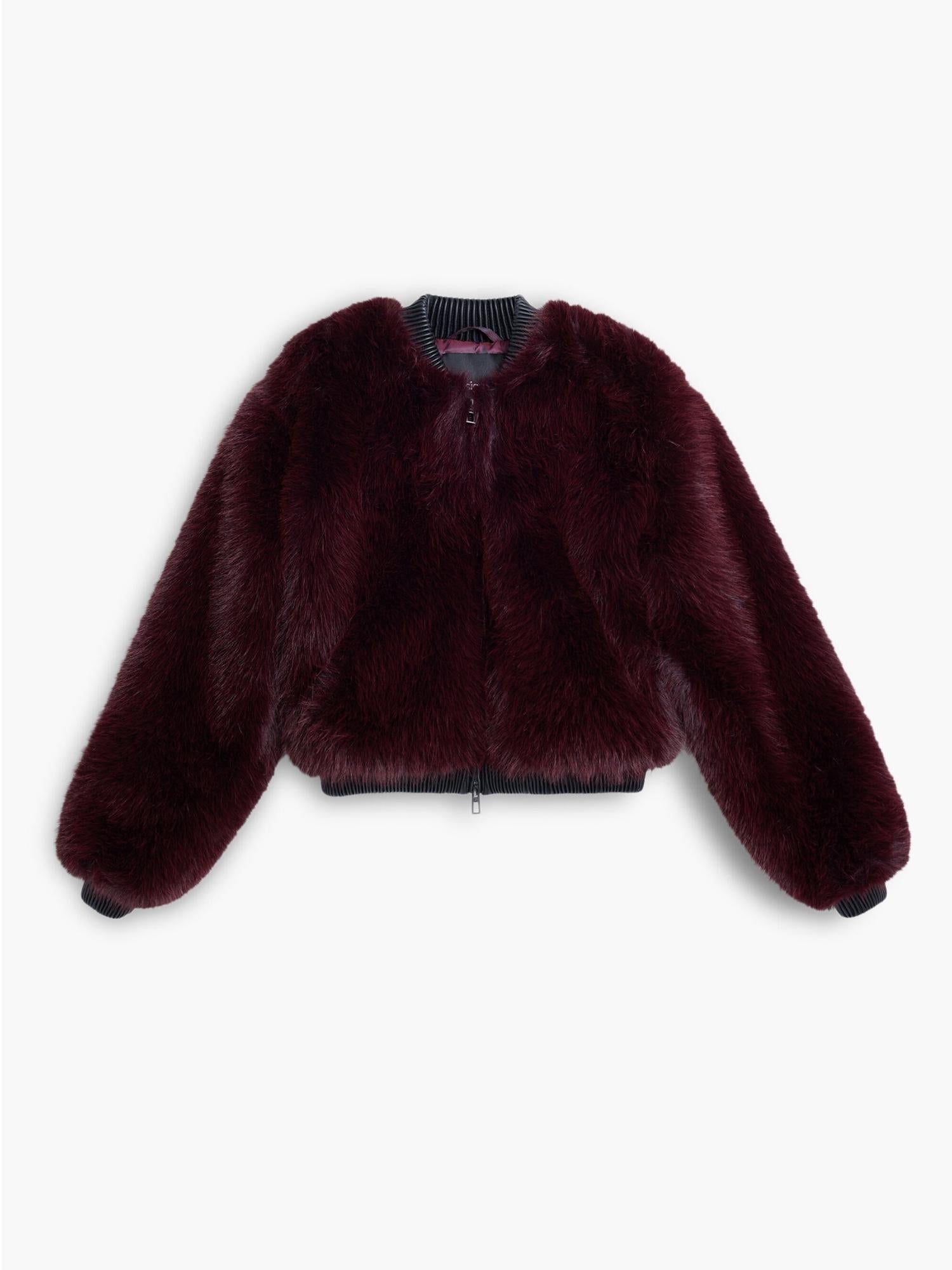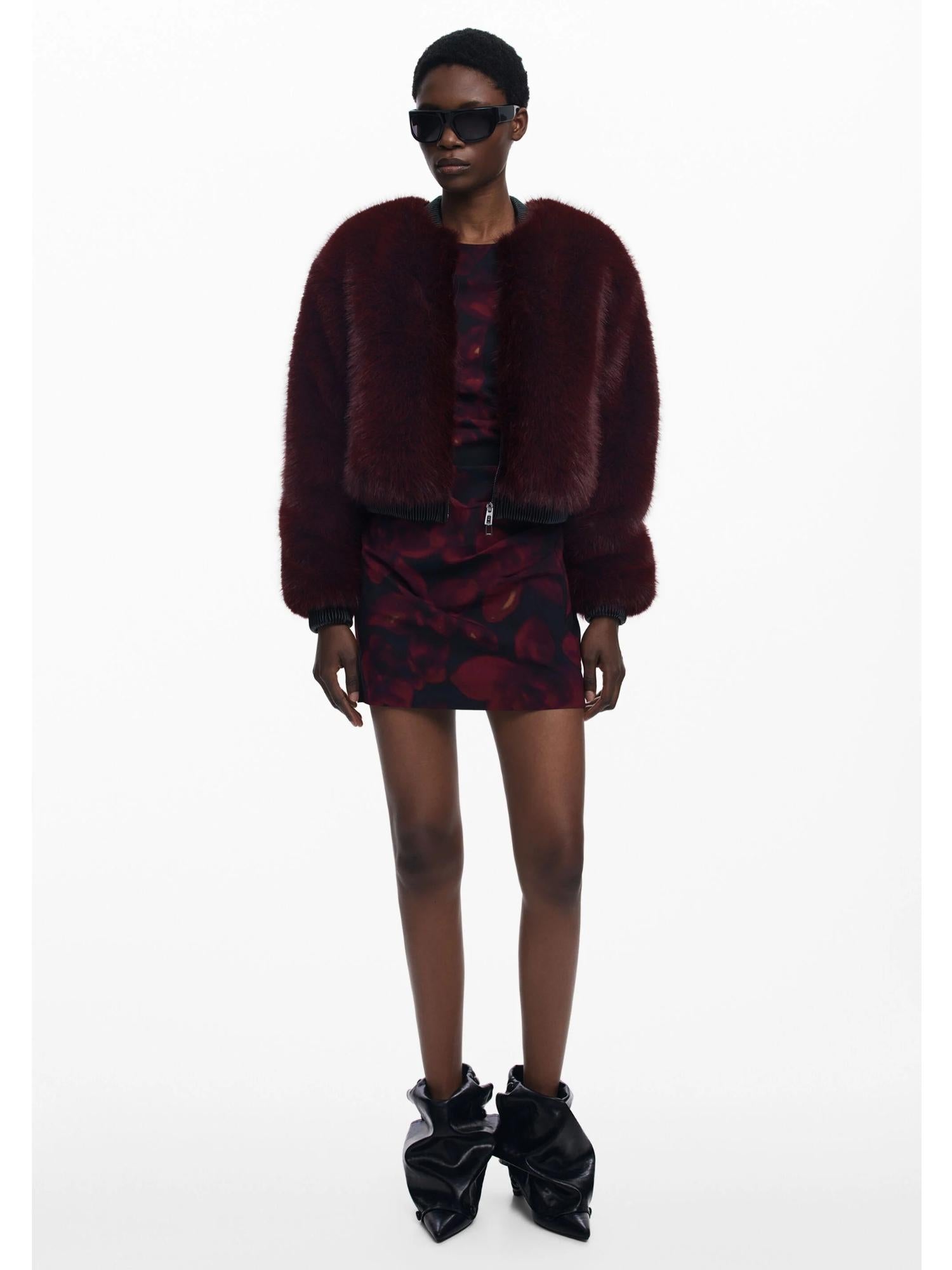 Short faux fur bomber jacket with a knitted collar and zip closure in raspberry. Color: Solid. Regular fit. Crew neck. Long sleeves. Zip closure. Knit collar. Faux fur. AW25 collection. Designed in Barcelona. Recycled polyester. Model measurements: height 180 cm, waist 61 cm, hips 89 cm. Model size: M. Outer fabric: 100% polyester. Inner fabric: 52% polyester, 48% viscose.