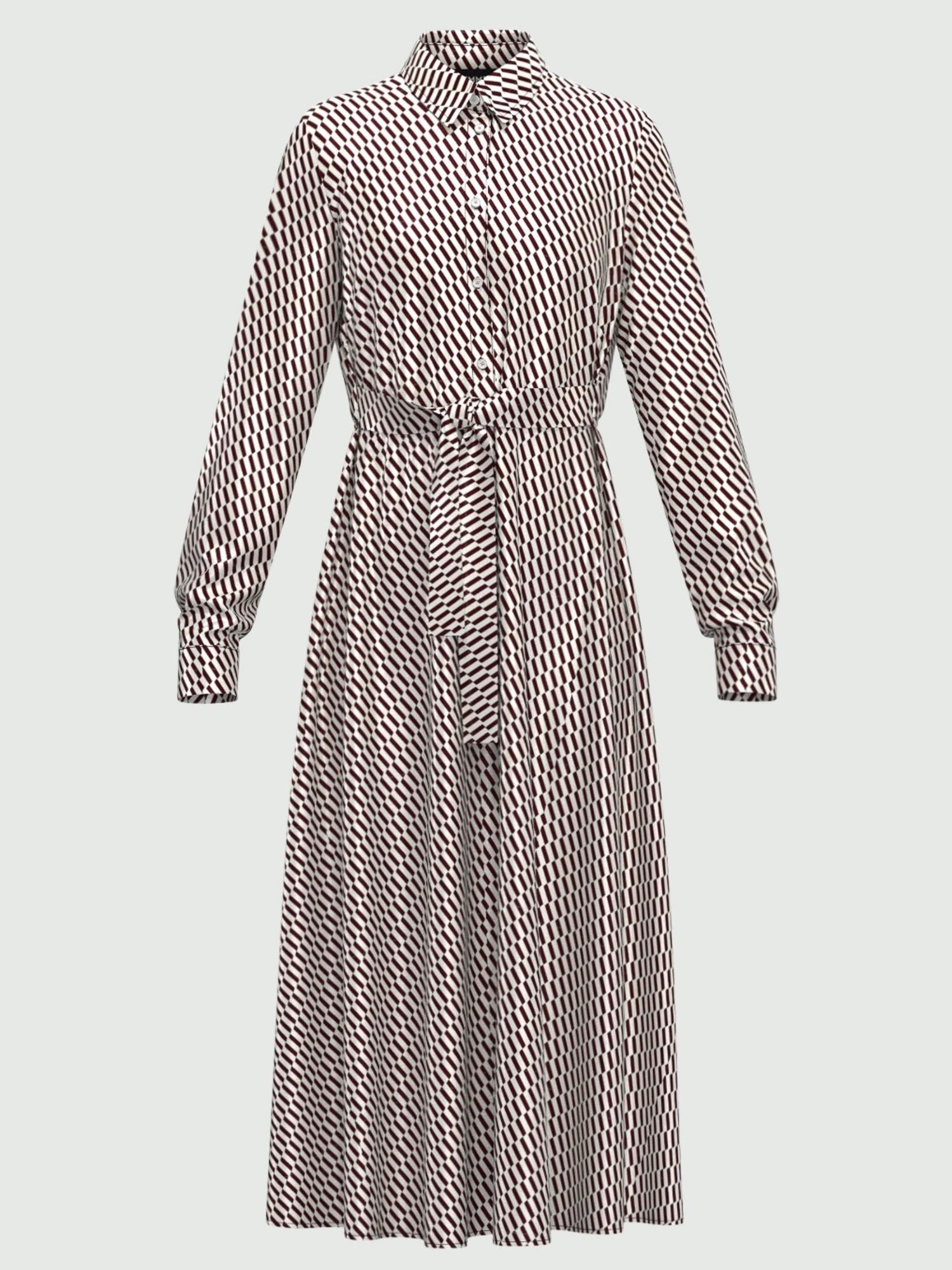 The most versatile, the most beloved: this twill shirt dress accentuates the silhouette thanks to the fixed ribbons that tie at the front. Complete with slingbacks or ballet flats, depending on your mood. Main fabric contains more than 50% recycled polyester. Printed technical twill dress. Straight fit with a slightly full skirt. Shirt collar opening to the waist and exposed buttons. Elastic insert at the back of the waist and belt set into the sides. Buttoned cuffs. Composition and care instructions: machine wash max 30 degrees with reduced heat; do not bleach; do not tumble dry; line dry in the shade; cool iron max 120 degrees C; delicate dry clean with perchloroethylene. 100% polyester.