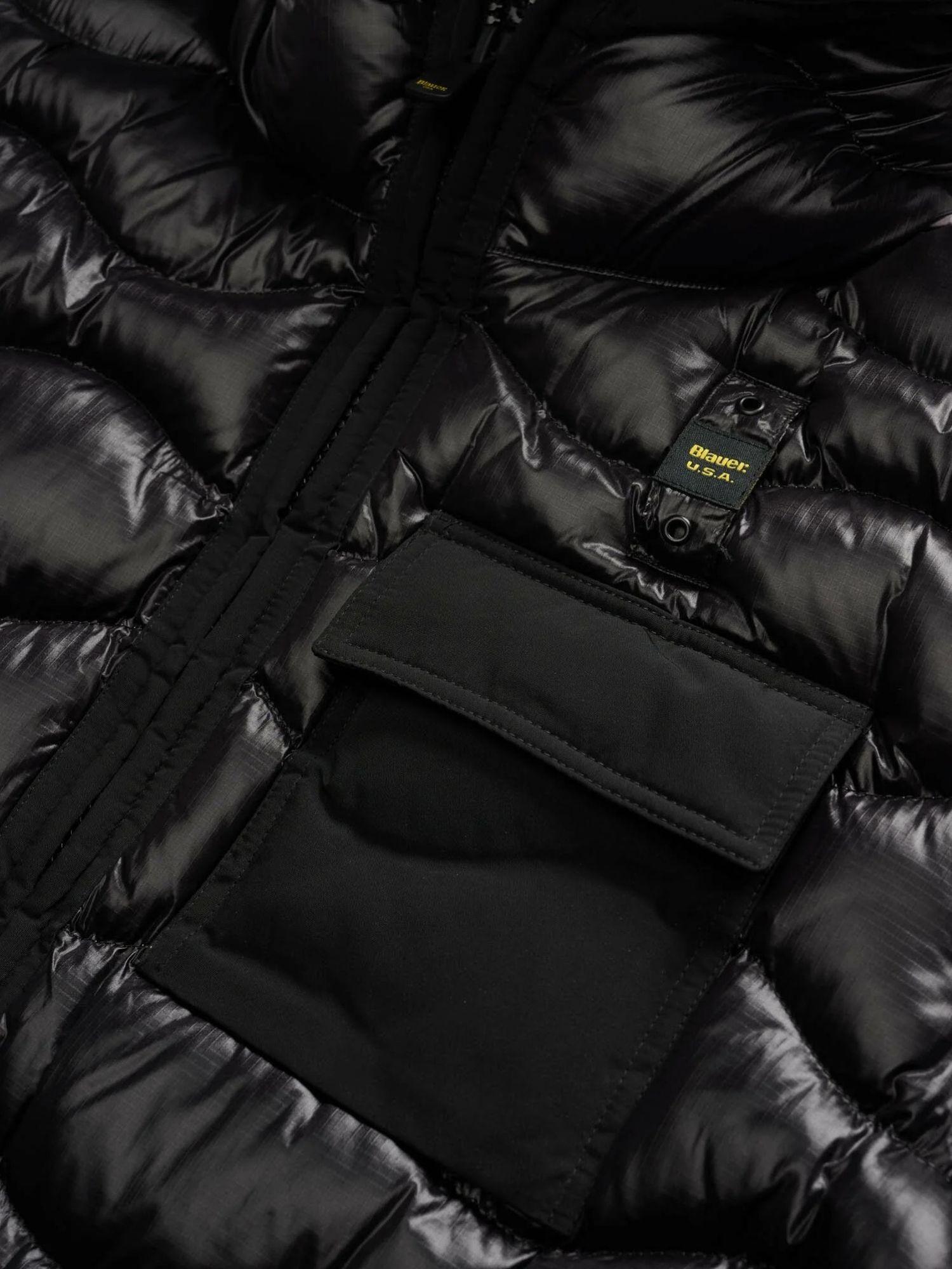 This water-repellent Blauer men's jacket is crafted from micro-rip nylon with a subtle check pattern and tone-on-tone taslan inserts on the hood, zippers, and chest pocket. The fixed drawstring hood and contrasting lining add functionality and character. Padded with sustainable Sorona® Aura wadding, it offers warmth, comfort, and shape retention. It features a hidden zip closure, front pockets with invisible zips, a chest pocket with Velcro, and an adjustable drawstring hem for a personalized fit. Inside, it features large open pockets and small Velcro-closing pockets. Finished with a Blauer logo patch and loop, symbols of quality and authentic style.